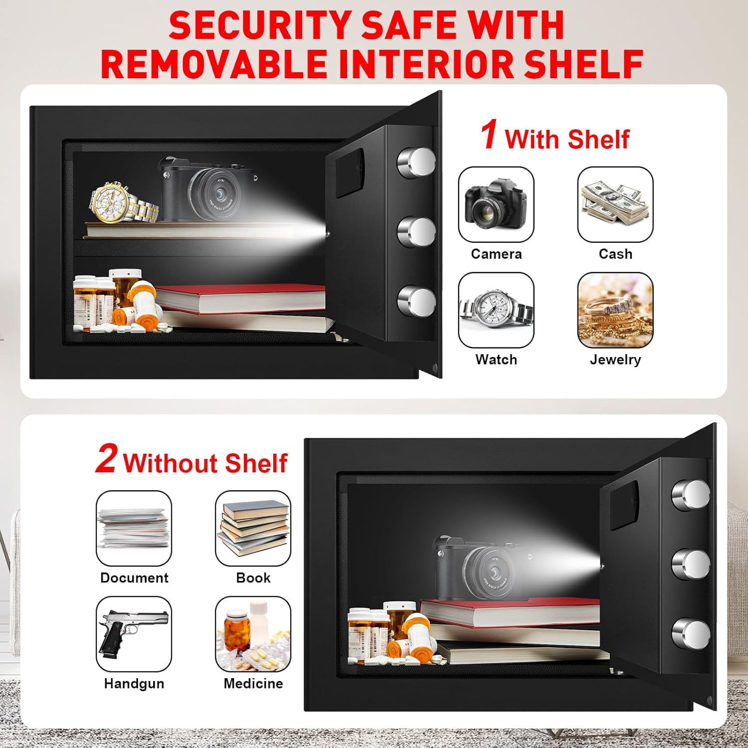 ??ADJUSTABLE CAPACITY SAFE??The compact size makes the small safe box easy to hide in drawers, cabinets, or wardrobes. Whether you want to create separate compartments for different items or maximize the storage capacity for larger valuables, the removable shelf offers the flexibility to adapt to your requirements. This fireproof safe for home can protect your money, jewelry, passport, medicine, hand guns, documents, social security cards, etc. PERFECT FOR HOME, HOTEL, DORM AND OFFICE.