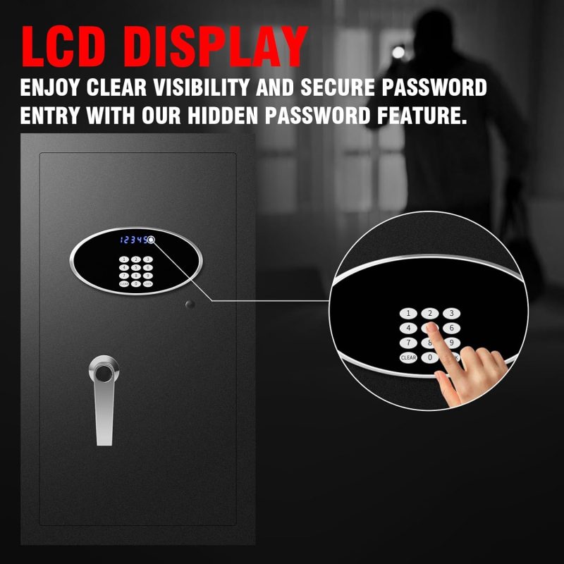 ??LCD SCREEN COMBINATION LOCK STEEL SAFETY BOX??Personal safe deposit box is equipped with a visual display and electronic keypad lock and key lock. Showing your input as you type in your security code. It supports the deletion of incorrect passwords, It also features a password-hiding function to prevent others from seeing your password. The fire safe box for home is also equipped with two emergency keys. Even if you forget the password, you don’t have to worry that your items can’t be taken out. This cabinet safe is perfect for securing items AWAY FROM KIDS, THIEVES, AND PEOPLE YOU DON’T TRUST.