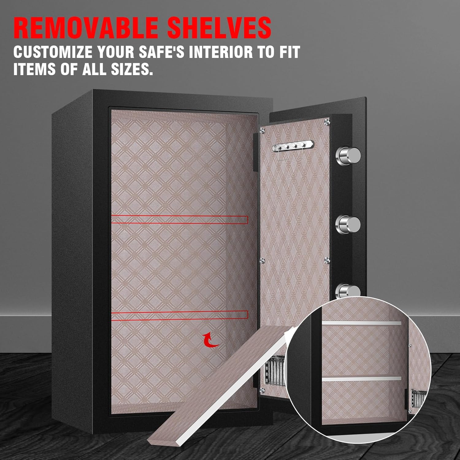 ??LARGE ADJUSTABLE CAPACITY SAFE??Fire proof safe for home documents can protect almost all valuable assets and belongings, such as medication, laptops, gold bars, money, mail, check payment, files, hand guns, pistols, documents, birth certificates, and social security cards. Designed with removable shelves, this cabinet safe can accept multiple sizes of valuables. PERFECT FOR HOME, HOTEL, BUSINESS AND OFFICE.